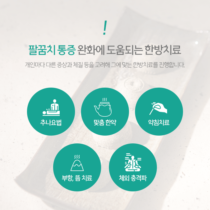 쑥을 활용한 뜸과 온열치료는 따뜻한 기운으로 혈류순환을 촉진하며 통증과 염증을 줄여주면서 기능회복에 도움이 됩니다. 그리고 부항은 음압방식으로 어혈을 제거하여 회복을 돕는 한방치료입니다. 외에도 다양한 한방치료는 건강상태, 팔꿈치 통증 원인과 동반되는 문제에 따라 다르게 적용되므로 담당 의료진과 상담을 통해 확인할 수 있습니다.