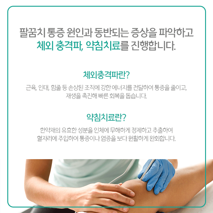 순수한 한약성분에서 추출해 정제한 약물을 주입하는 약침치료는 팔꿈치 주변 어혈을 제거하고 기혈순환을 촉진해 염증과 통증을 줄여줍니다. 약물에 따라 여러 방법이 있으며 주요 성분에 대한 알레르기 반응을 고려해 진행하는 한방치료입니다.