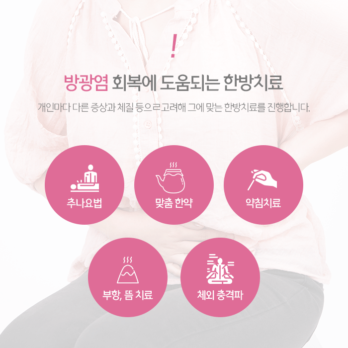 다양한 배뇨장애를 유발하는 과민성 방광과 방광염은 신장, 간, 비위의 기능이 저하되거나 기혈순환의 균형이 무너진 결과로 나타납니다. 그리고 여러 원인으로 방광의 수축력이 약해진 경우, 몸이 차서 순환이 떨어진 경우, 염증 후 면역력이 약해진 경우 문제가 나타나므로 이를 고려해 한약, 침과 약침, 부항, 뜸, 추나요법 등 한방치료를 진행합니다.