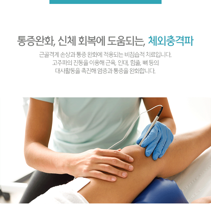 이와 함께 많이 활용되는 체외충격파치료는 신생혈관을 형성하고 조직의 재생을 도와줍니다. 과한 긴장을 줄여 신경의 압박을 풀어주기 때문에 사고 후 통증 및 저림증상 완화 등에 도움되는 방법입니다.