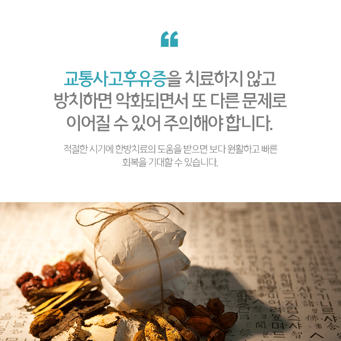 다양한 교통사고 후유증과 체질에 맞는 약재를 구성해 조제되는 한약은 어혈을 제거하고 기혈순환을 촉진해 염증과 통증을 완화하여 여러 후유증 회복에 도움이 됩니다. 그리고 사고 충격으로 손상된 신체 조직의 재생과 함께 혈액을 생성해 면역력 향상과 전반적인 건강증진을 기대할 수 있습니다.