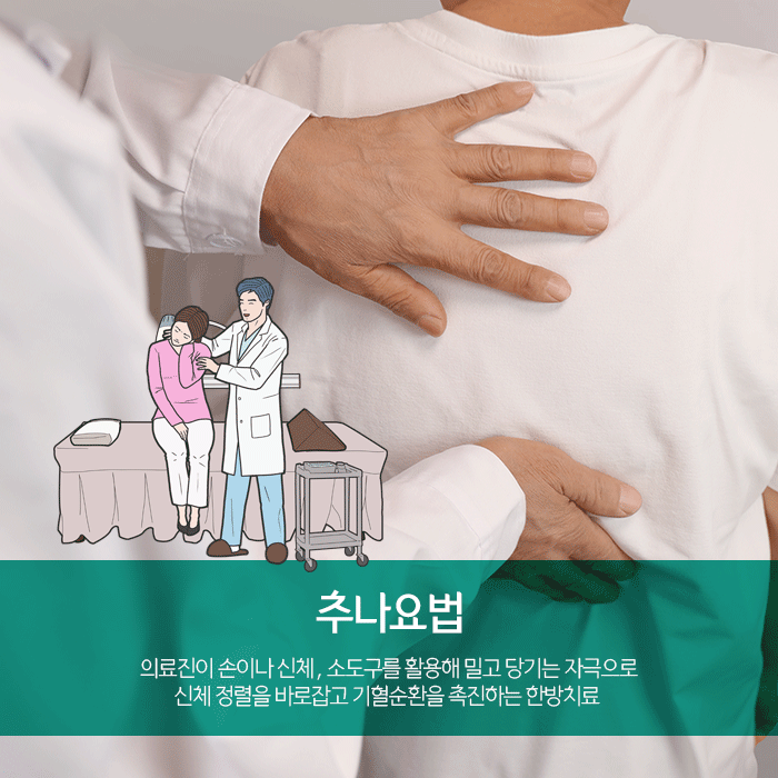 이러한 어깨질환으로 인한 문제는 초기에 치료하면 비수술적인 한방치료로 회복할 수 있습니다. 어깨통증을 완화하고 기능회복을 위해 추나요법, 한약, 침과 약침, 뜸, 봉침 등 한방치료를 진행합니다. 추나요법은 한의사가 손이나 도구를 이용해 틀어진 어깨 관절의 정렬을 바로잡아 부담을 줄이고 기능 회복을 돕는 방법입니다.