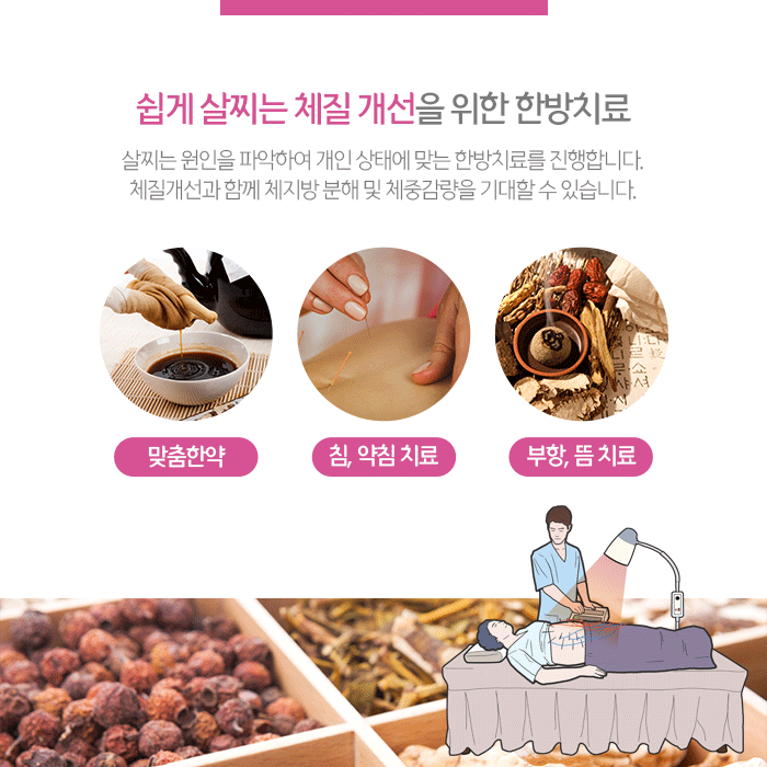 그래서 체내 노폐물 배출과 부종완화를 위한 한방치료가 적용됩니다. 이처럼 살이찌는 원인은 개인 몸 상태와 체질에 따라 다르기 때문에 확인하여 체중감량 목표를 세우고 진행하는 것이 중요합니다. 쉽게 살찌는 체질을 개선하고 체중감량을 위해 한약, 추나요법, 침과 약침, 부항, 뜸 등 한방치료를 진행합니다.