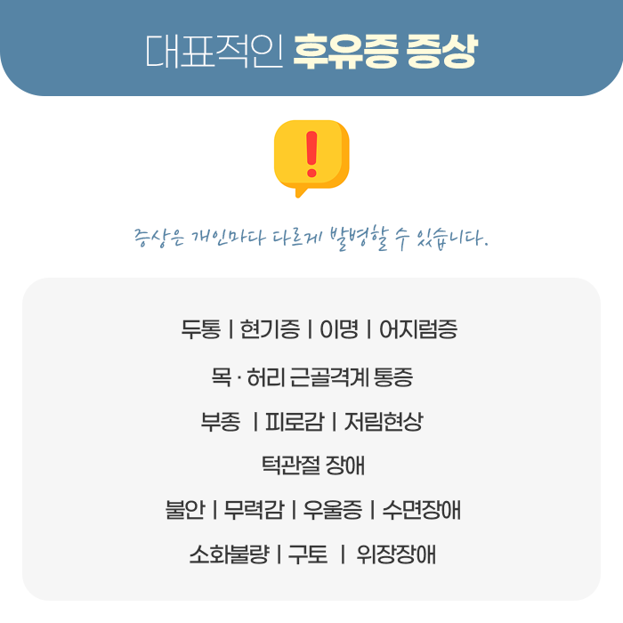 어혈이 지속되면 혈액 순환을 막기 때문에 염증 반응을 유발하여 여러 가지 통증이나 증상을 남깁니다. 더하여 각종 합병증까지 이어질 수 있습니다. 후유증은 개인마다 증상이 다를 뿐만 아니라 회복의 효과와 속도도 다르기 때문에 치료는 획일화 되지 않고 개인에 따라서 맞춤 치료가 진행되어야 합니다.