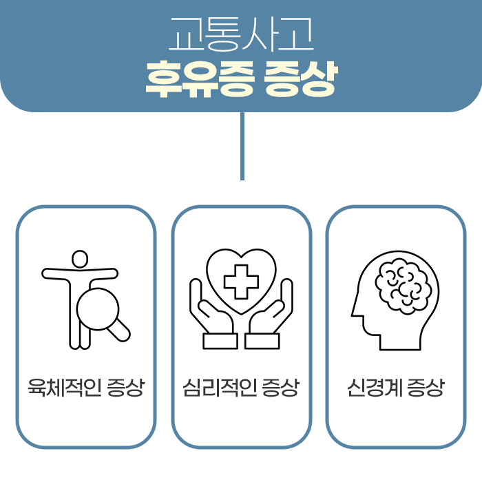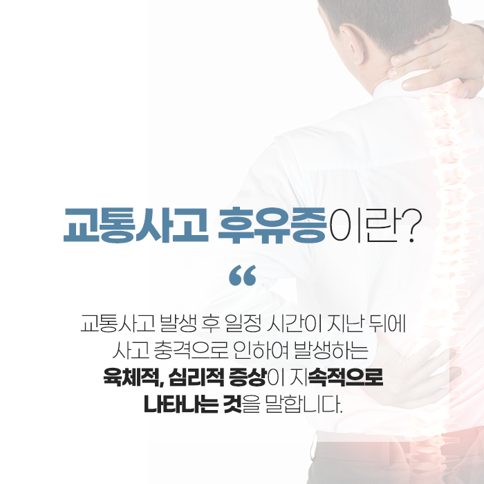 갑작스럽게 발생하는 교통사고는 처리의 과정도 중요하지만, 후유증을 잘 대처하는 것이 무엇보다 중요합니다. 사고 발생 4주간의 치료 과정이 핵심이 될 수 있는데요. 사고 당일이나 1~2일 정도는 괜찮을 수 있으나 일상 생활을 하면서 신체를 사용하다보면 증상이 나타나거나 서서히 통증이 유발될 수 있습니다.