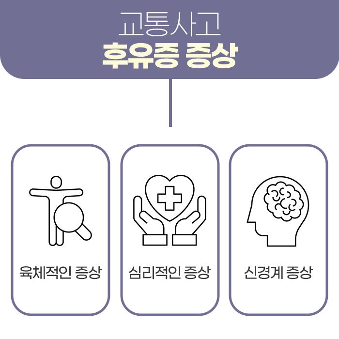 또한 충격으로 인하여 허리 및 골반 등의 관절에도 영향을 미칩니다. 통증 때문에 생활이 불편해지고, 장기적은 증상으로 이어질 수 있기 때문에 주의해야 합니다 허리 통증은 만성화가 되거나 평생 질병으로도 남을 수 있기 때문에 바른 치료가 적용되어야 합니다. 사고가 난 뒤에 긴장감이 해소되지 않거나 스트레스로 인하여 두통을 호소하기도 하고 집중력 저하, 어지럼증 등의 여러 증상들도 흔히 나타나는 후유증입니다.