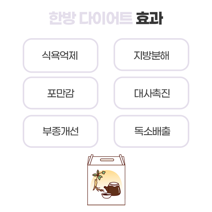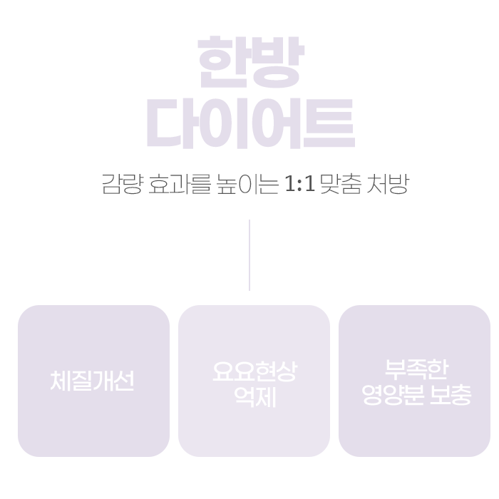 한의학적 과체중 및 비만 치료는 칼로리를 적당히 소모하게 돕고, 신진대사 활성화를 통하여 진행됩니다. 몸에 무리를 받지 않도록 식사량을 조절하고 식욕을 낮추어 줍니다. 또한 탄수화물이 지방으로 합성되지 않도록 막아주는 효과와 체지방이 쌓이지 않게 지방 합성 억제의 효능을 더해줍니다. 한약은 개인의 체질에 따라서 다른 배합으로 제조되어 1:1 맞춤으로 처방합니다. 일반적으로는 신진대사 개선과 식욕 조절의 효능을 주도록 배합합니다.