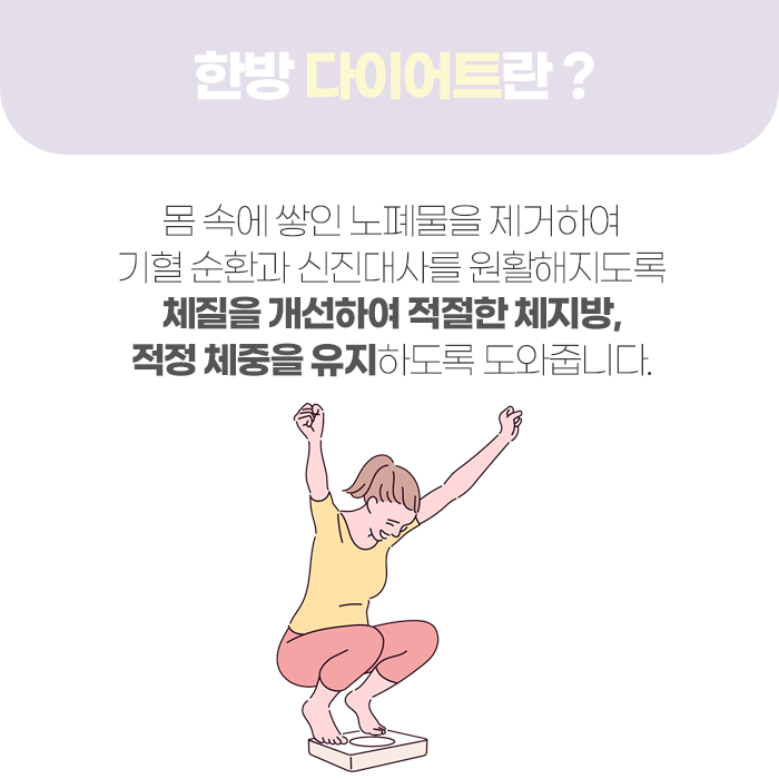 출산 후 다이어트나 사이즈 감소를 원하시는 분들에게도 한방 다이어트가 도움이 될 수 있습니다. 개인마다 체질이 다르므로 맞춤으로 처방이 이루어집니다. 체중을 감량하도록 도와주고 체질을 개선하여 줍니다. 또한 산모둘의 큰 고민거리인 붓기를 제거하도록 도와줍니다.