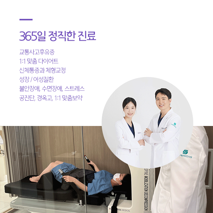 적절한 시기의 한방치료와 함께 재활치료, 잘못된 습관 개선 등이 병행된다면 보다 원활한 회복과 재발 예방을 기대할 수 있습니다. 스마일365한의원에서는 반복되는 허리통증을 줄이고 초기 디스크 회복을 위해 추나요법, 한약, 약침, 부항, 뜸 등의 복합적인 한방치료를 진행합니다.