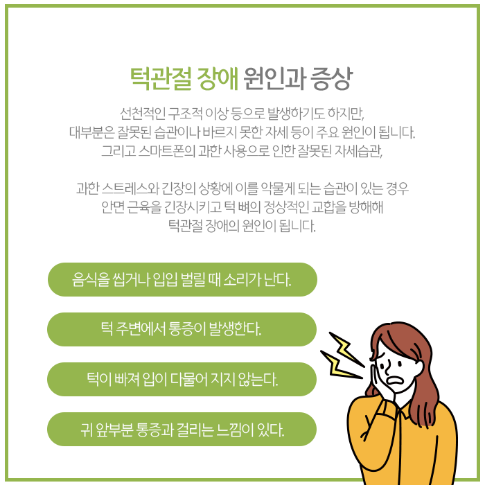 턱관절 장애는 온도가 낮아지면 혈관이 수축하면서 근육의 긴장도를 증가시키기 때문에 날씨가 추워지면 많이 발생하기도 합니다. 그리고 과한 스트레스, 목 부위의 과도한 긴장으로 인한 구조적 불균형으로 인해 발생할 수 있습니다.