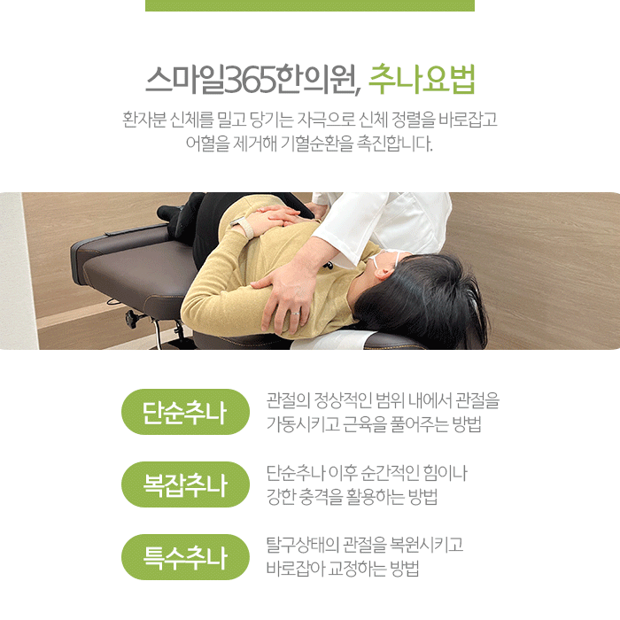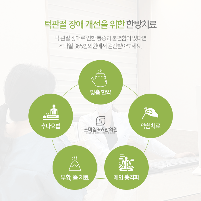 스마일365한의원에서는 턱관절장애와 동반되는 문제 개선을 위해 추나요법, 한약, 약침, 부항, 뜸 등의 복합적인 한방치료를 진행합니다. 칠성동 턱관절을 잡고, 지지하는 근육과 턱관절 운동의 중심축인 척추까지 바로 잡아야 재발을 예방할 수 있습니다. 그래서 진행하는 추나요법은 의료진이 손과 신체, 소도구 등을 활용해 환자분 틀어진 신체를 밀고당기는 자극으로 신체정렬을 바르게 하고 어혈을 제거해 기혈순환을 촉진하는 한방치료입니다.