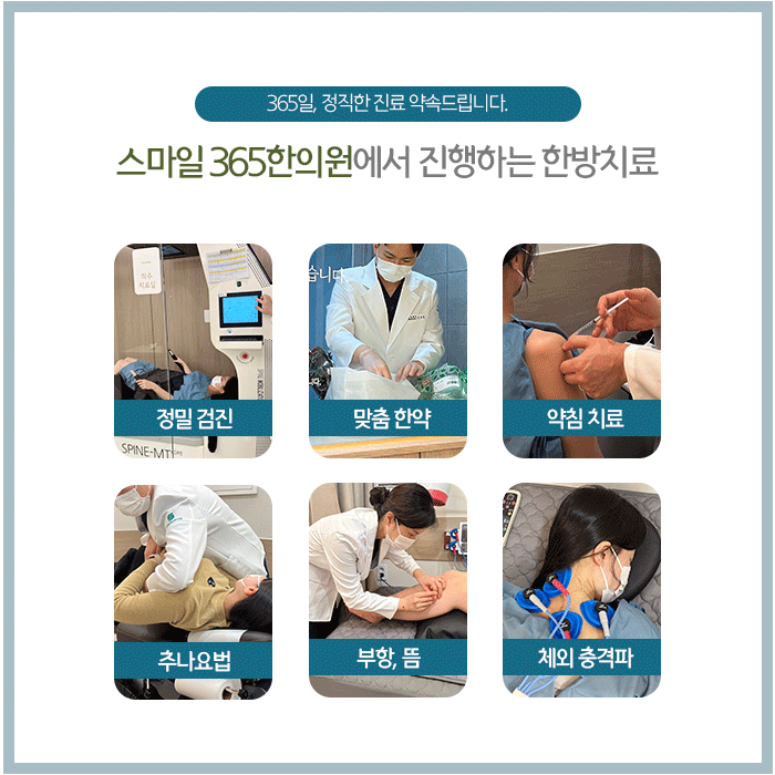 스마일365한의원에서는 통합적인 한방치료로 중이염 회복을 도와드립니다. 그리고 과잉진료 없이 환자분에게 꼭 필요한 치료만 하며 검증된 재료와 방법으로 정직한 진료를 약속드립니다. 매일 밤 8시까지 진료하며, 주말과 공휴일에는 3시까지 진료하고 있으므로 참고하셔서 이용에 불편없으시길 바랍니다.