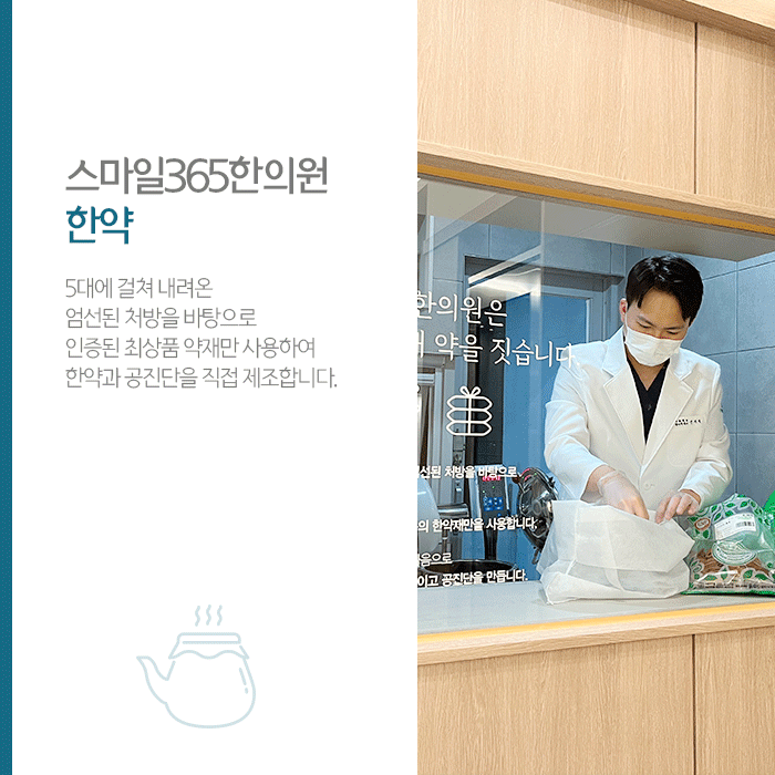 스마일365한의원에서는 5대에 걸쳐 엄선된 처방을 바탕으로 인증된 최상품 사용하여 직접 제조합니다. 그리고 개인 건강상태와 중이염 증상에 따라 복용횟수와 기간이 달라질 수 있습니다.