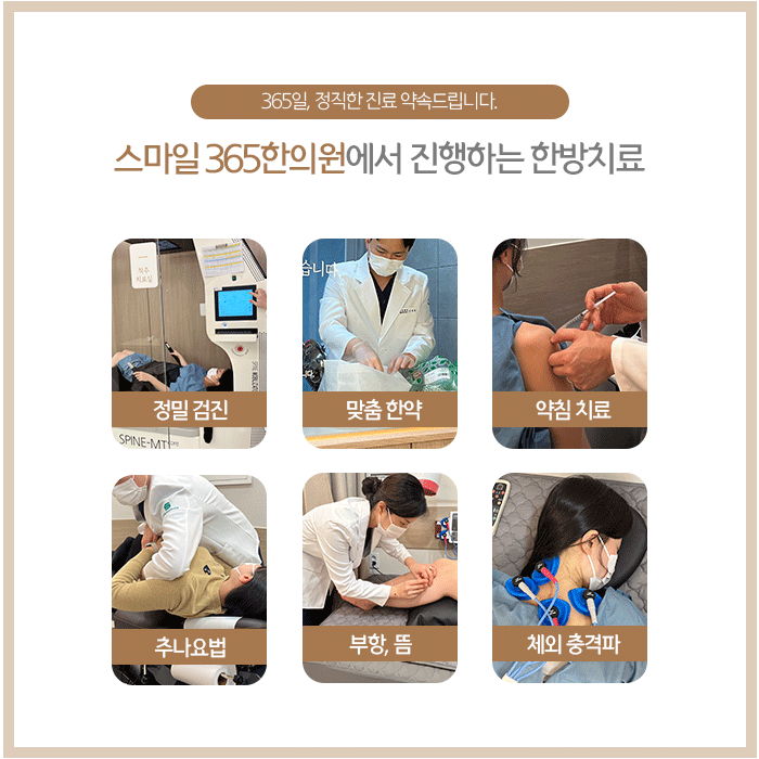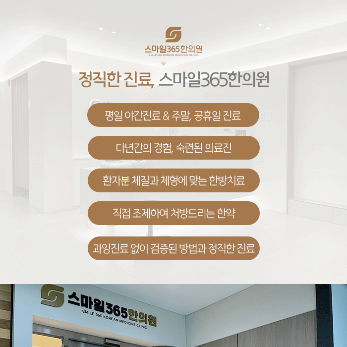 스마일365한의원에서는 정밀한 검진과 통합적인 한방치료로 축농증 증상 개선과 면역력 증진을 도와드립니다. 그리고 교통사고후유증, 1:1 맞춤 다이어트, 신체통증, 체형교정, 어린이 성장, 여성질환, 불안장애, 수면장애, 공진단, 경옥고, 보약 등 진료합니다.