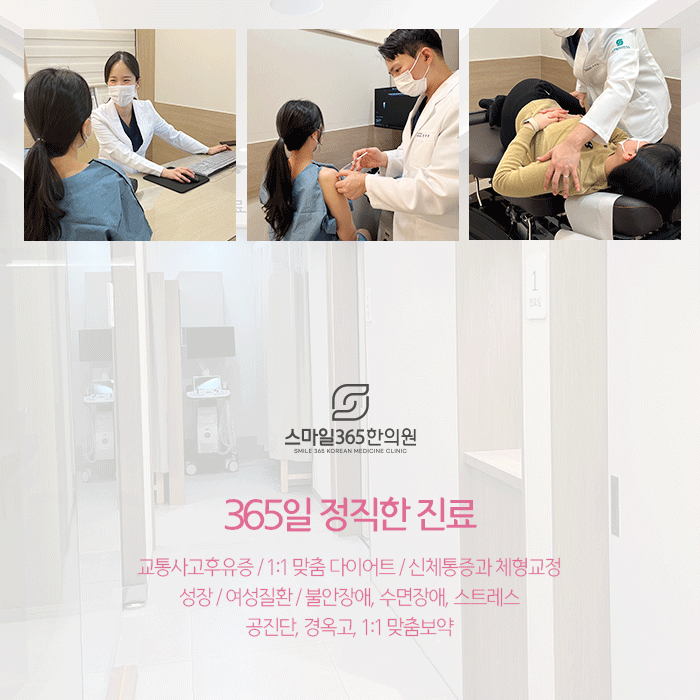 침산동 유산후몸조리에 도움되는 추나요법은 개인마다 다른 체형을 고려해 문제가 되는 정확한 부분을 적당히 자극해야 하므로 의료진의 숙련도가 요구됩니다. 그래서 경험과 노하우가 많은 스마일365한의원 의료진을 통해 진행하는 것을 추천드립니다.