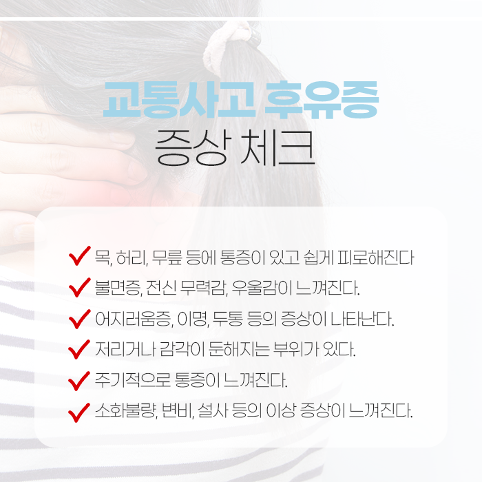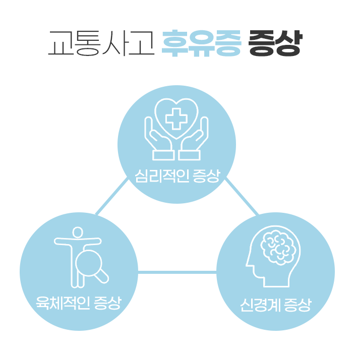 이러한 육체적인 증상 뿐만 아니라 신경계의 증상이 생기기도 합니다. 두통, 어지럼증, 집중력 저하, 기억력 감퇴 등의 현상이 있습니다. 그리고 불안감, 우울감, 초조함, 외상 후 스트레스 장애 등의 심리적인 증상이 생기기도 합니다. 이 외에도 부종, 피로감, 불면증, 더부룩함, 구토, 속 메스꺼움 등 여러 가지 증상들도 사고로 인한 후유증에 속합니다. 증상은 곧바로 나타나기도 하지만 며칠내지 몇주 후에 서서히 발생할 수도 있기 때문에 잘 관찰해야 하고 관리해야 합니다.