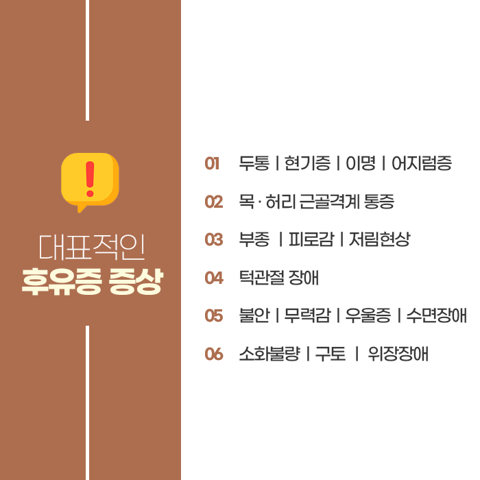 지금 당장 괜찮다고 여겨지더라도 1~2주 정도는 컨디션 및 건강 상태를 꼼꼼하게 살펴보아야 합니다. 불편함이나 이상 증상이 유발되기 전에 신속하게 진단과 치료 필요합니다. 후유증은 일반적으로 2~7일 정도가 지나면 나타나는 경우가 많습니다. 하지만 최대의 경우 수개월까지 잠복기가 이어질 수 있습니다.