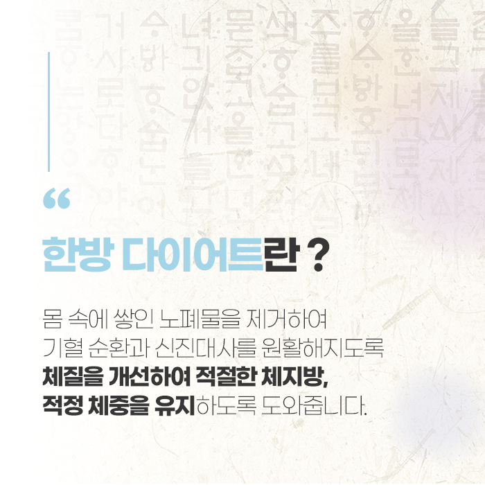 하지만 단순히 한약 복용하는데만 의존하기 보다 일상 속에서 식습관을 개선하고 평소 꾸준하게 운동을 더해주는 등 생활 습관을 개선하는 것이 더해져야 합니다. 건강하게 살을 빼려면 체중에만 집중하기 보다는 체성분도 잘 관리해야 합니다. 건강 상태, 개인 체질 등에 따라 목표 몸무게를 설정하여 체계적으로 감량해야 합니다.