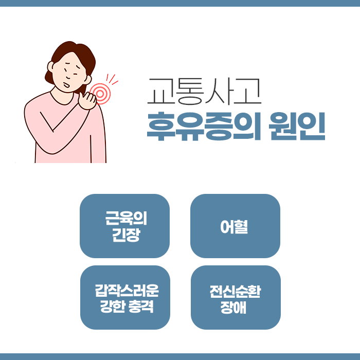교통사고가 나면 차량 파손이나 밀린 업무를 처리하는 등 신경 쓸 일들이 많습니다. 그러나 무엇보다 후유증이 발생하지 않도록 건강을 살피고 진료를 받아야 합니다. 사고 당일로부터 4주 동안의 치료 과정이 가장 중요합니다. 경미한 정도의 사고규모는 사고 당일부터 하루이틀 정도는 증상을 곧바로 느껴지지 않기도 합니다. 그러나 생활 속에서 몸을 사용하면서 뒤늦게 통증이 나타나거나 증상들이 서서히 나타나게 됩니다.