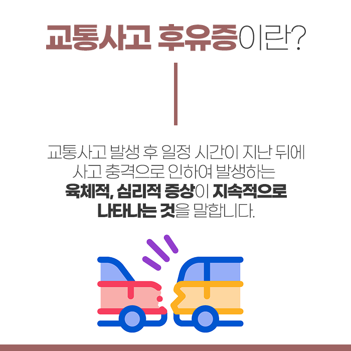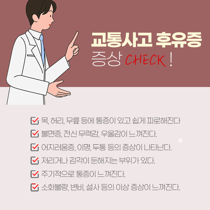 이러한 신체적인 증상 외에도 외상 후 스트레스, 불안감, 우울감, 초조함 등 심리적인 증상이 있습니다. 게다가 더부룩함, 메스꺼움, 구토, 가슴 두근거림, 부종, 피로감, 불면증 등 여러 가지 증상들도 교통사고 후유증의 대표적인 증세입니다. 증상은 곧바로 유발되기도 하지만 며칠 혹은 몇주 후에 유발되는 경우가 많기 때문에 신경써서 관리해야 합니다.