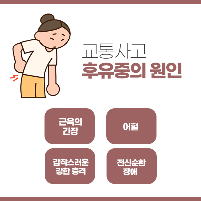 어혈 때문에 혈액 순환을 방해하게 되면서 염증 반응이 발생하고 어혈의 독이 전신으로 퍼지게 되면서 다양한 부위에 통증과 여러 가지 불편함들이 유발됩니다. 그러므로 병변 개선 후에도 원인을 알 수 없는 증상이 지속될 경우 교통사고 후 어혈 배출과 제거의 치료 과정이 필요합니다. 후유증은 개인마다 증상이 다르므로 경과 및 회복 속도도 다를 수 있기에 획일화된 치료가 아닌 맞춤형으로 치료해야 합니다.