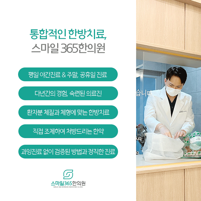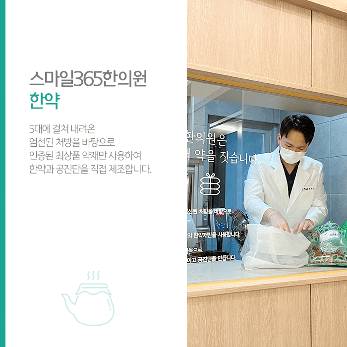 환자분 체질에 맞는 약재를 구성해 조제되는 한약은 호흡기 주변 어혈을 제거해 기혈순환을 촉진하고, 염증을 완화하여 기침과 동바되는 증상을 개선합니다. 그리고 호흡기와 심폐기능 회복에 도움이 되고 건강한 혈액을 생성해 장부기능을 강화합니다.