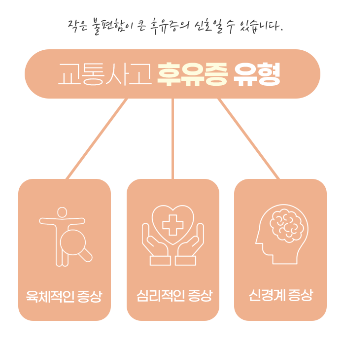 교통사고는 그 순간만으로도 큰 충격을 주지만, 더 무서운 것은 시간이 흐른 뒤에야 서서히 드러나는 '후유증'입니다. 특히 가벼운 접촉 사고라 하더라도 인체는 상당한 충격을 받을 수 있으며, 사고 직후 별다른 증상이 없어도 며칠이 지나고 나서야 통증이나 불편함이 나타나는 경우가 많습니다. 이러한 교통사고 후유증은 대부분 신체 내부에서 조용히 진행되기 때문에 조기 발견과 치료가 무엇보다 중요합니다. 개인차가 크기 때문에 어떤 사람은 하루 이틀 만에, 또 어떤 사람은 몇 주, 심지어는 몇 달 후에 후유증을 겪게 되기도 합니다.