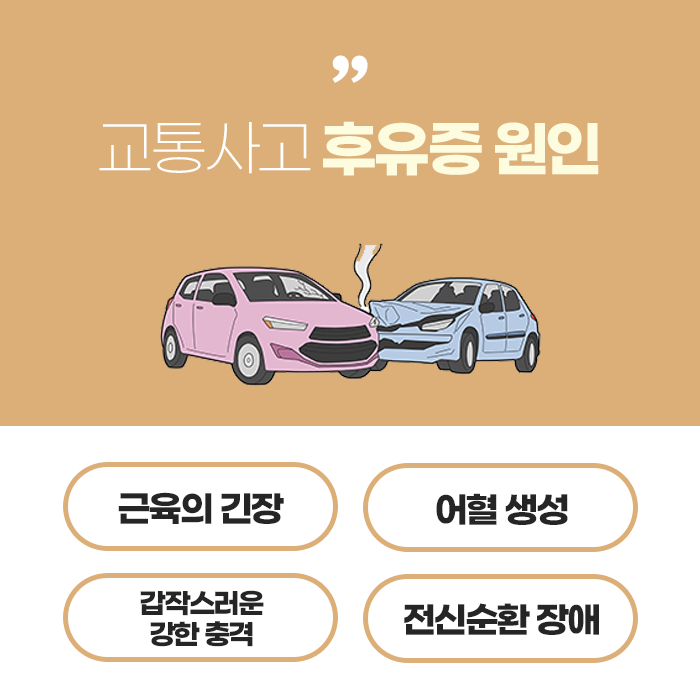 하지만 시간이 지나 일상생활을 하다 보면 통증이 서서히 드러나는 경우가 많아 최소 일주일 이상은 몸 상태를 꼼꼼히 살피고, 증상이 없더라도 예방 차원에서 검진을 받아보는 것이 좋습니다. 초기 치료를 소홀히 하면 예상보다 긴 치료 기간과 만성 통증으로 이어질 수 있으니 주의해야 합니다. 교통사고로 인한 후유증은 보통 2~7일 사이에 발생하지만 사람에 따라 수주에서 수개월 후에 증상이 나타나는 경우도 적지 않습니다.