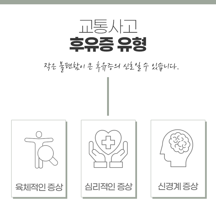 교통사고 후유증은 사고 직후보다는 보통 2~7일이 지난 시점에서 본격적으로 나타나며, 사고 충격의 정도나 개인의 체질에 따라 수개월이 지난 뒤에야 증상이 발생할 수도 있습니다. 특히 목의 염좌(편타성 손상)는 교통사고 후 가장 흔히 발생하는 증상으로, 사고 당시 머리가 앞뒤로 과도하게 흔들리면서 목 주변 근육, 인대, 디스크 등에 손상이 생겨 통증과 함께 목의 움직임이 제한되거나 팔과 손의 저림이 동반되기도 합니다. 뿐만 아니라 사고로 인한 심리적 충격으로 인해 불안감, 우울감, 집중력 저하, 수면장애 같은 정신적 증상까지 나타날 수 있습니다.