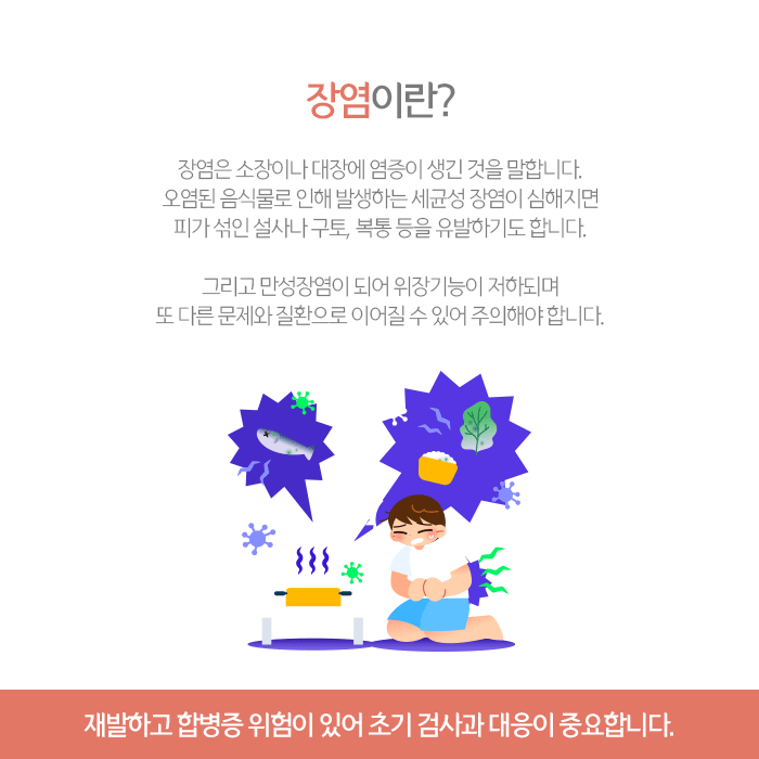 장염은 세균이나 바이러스가 장 안쪽 세포로 침투해 염증을 유발하면서 발생하는데, 장내 세균이 증가하게 되면 장염 위험이 커지게 됩니다. 장염을 회복하기 위해서는 허약해진 장의 면역력을 강화하는 한방치료의 도움받는 것이 좋습니다. 그리고 장염 바이러스나 세균으로 인하여 손상된 장 세포 재생을 위해 영양공급도 중요합니다.