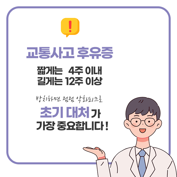 교통사고는 단순한 신체적인 충격을 넘어서, 신체적, 정신적으로 큰 영향을 미치는 사건입니다. 사고 당시의 충격보다도 그 후의 치료와 관리가 회복의 중요한 열쇠가 됩니다. 사고 후유증은 시간이 지나면서 더 뚜렷하게 나타날 수 있기 때문에, 초기에 적극적인 치료와 관리를 받는 것이 매우 중요합니다. 치료를 받으면서 신체적, 정신적 회복을 동시에 도모하고, 꾸준히 관리함으로써 일상생활로 무사히 돌아가는 것이 가능한 방법입니다.