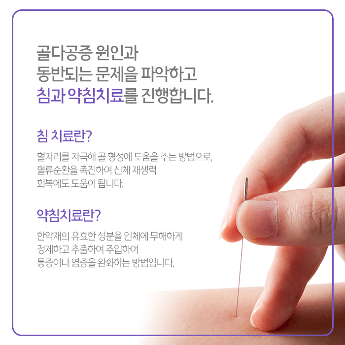 침은 혈자리를 자극해 골밀도 강화와 주변 근육과 인대의 회복을 통해 여러 문제를 개선합니다. 한약성분에서 추출해 정제한 약물을 주입하는 약침치료는 어혈을 제거하고 기혈순환을 촉진해 골밀 생성과 강화를 돕습니다. 주입되는 약물에 따라 여러 방법이 있고, 사용되는 약물의 알레르기 반응을 확인하여 적용합니다.