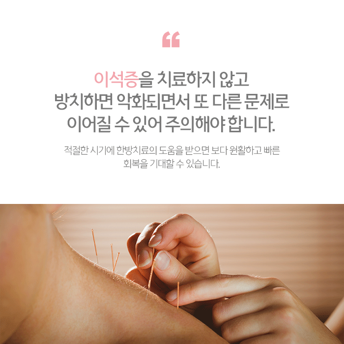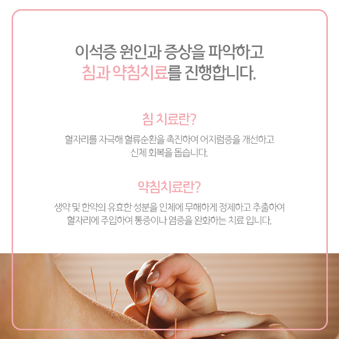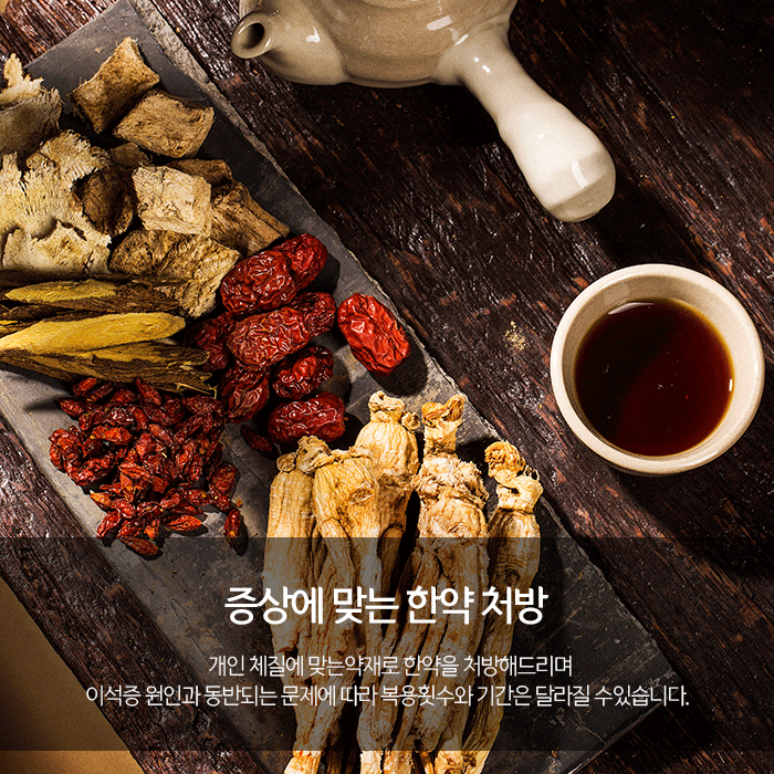 다양한 원인으로 발생하는 이성증 회복과 재발 예방을 위해 추나요법, 한약, 침과 약침, 부항, 뜸 등의 한방치료를 진행합니다. 환자분 체질에 맞는 약재를 구성해 조제되는 한약은 귀 주변 어혈을 제거하고 기혈순환을 촉진합니다. 그리고 건강한 혈액을 생성해 면역력 향상과 청력 회복 및 이석증 증상 개선을 돕습니다.