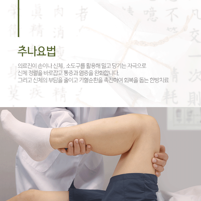 체내 어혈을 제거하고 편타성 손상으로 인한 교통사고 후유증 회복을 위해 추나요법, 한약, 침과 약침, 부항, 뜸 등의 한방치료를 진행합니다. 편타성 손상으로 인해 척추문제가 발생한 경우에는 추나요법을 적용합니다. 담당 의료진이 손, 신체, 소도구를 활용해 밀고 당기는 자극으로 사고 충격으로 틀어진 신체 정렬을 바로잡고 어혈을 제거해 기혈순환을 촉진하는 한방치료입니다.