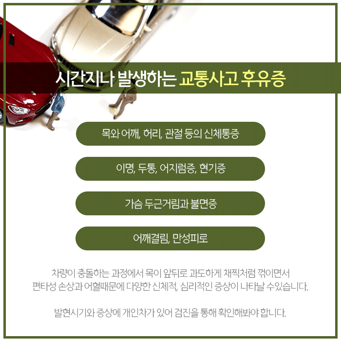 교통사고 후유증은 사고직후 바로 나타나는 경우도 있지만 수개월 후 잠복기를 거쳐 나타나는 경우가 많습니다. 그래서 사고 직후 뚜렷한 증상이 없어도 검사를 통해 확인해보는 것이 바람직합니다.